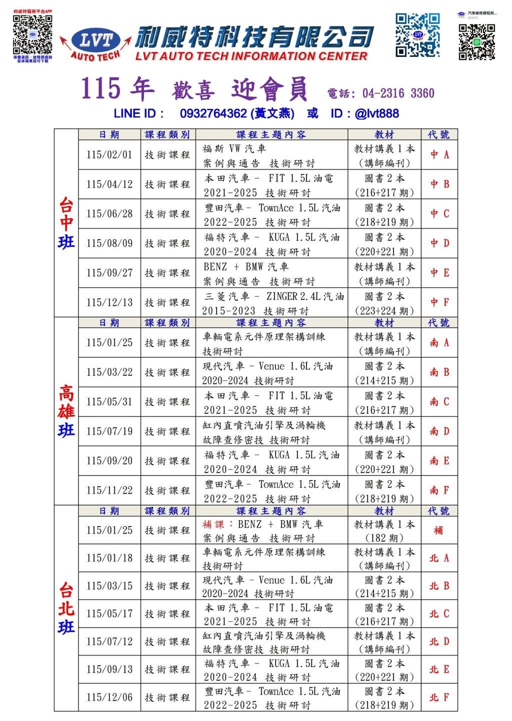 全台(台北、台中、高雄)-----2026年度課表